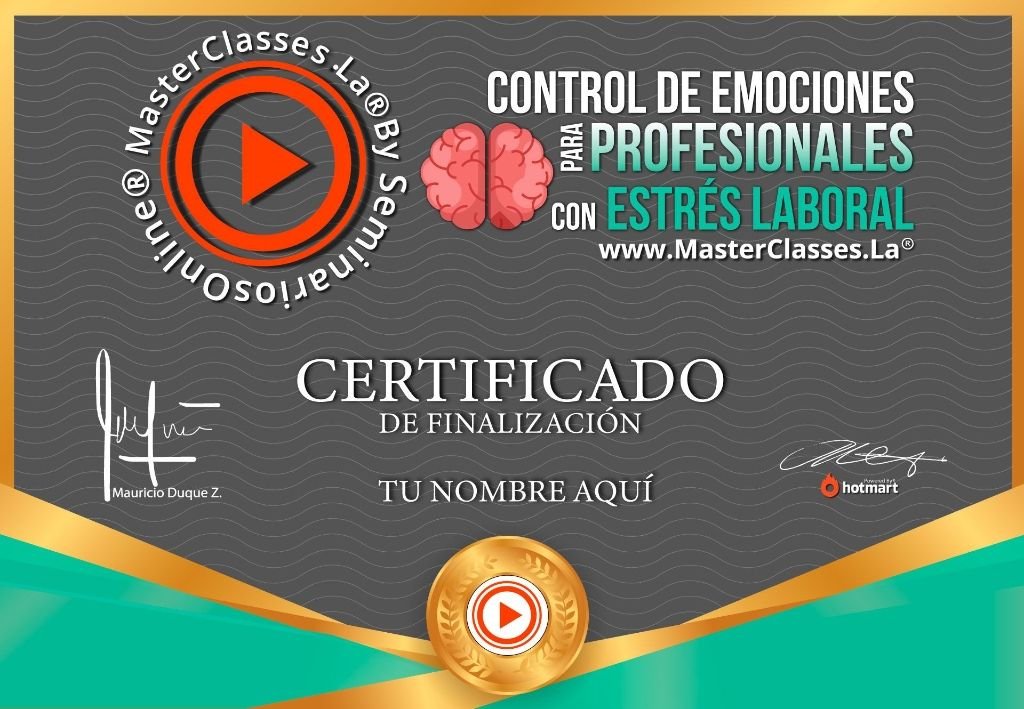 El MasterClass CONTROL DE EMOCIONES PARA PROFESIONALES CON ESTRÉS LABORAL te brinda las herramientas necesarias para gestionar el estrés y la ansiedad relacionados con el trabajo. Aprenderás a controlar tus estados emocionales, relajarte en situaciones difíciles y modificar creencias arraigadas. Además, tendrás acceso a técnicas de Programación Neurolingüística y recibirás un certificado avalado por Hotmart y Seminarios Online. No pierdas la oportunidad de alcanzar tus objetivos profesionales y mantener el equilibrio en tu vida laboral.